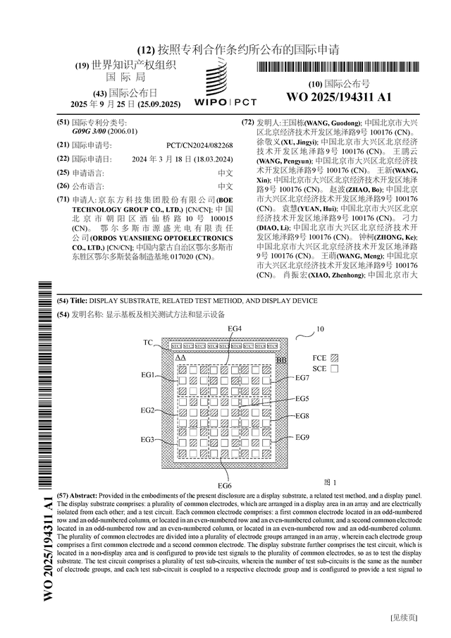 证券之星消息,根据企查查数据显示京东方A(000725)公布了一项国际专利申请,专利名为“显示基板及相关测试方法和显示设备”,专利申请号为PCT/CN2024/082268,国际公布日为2025年9月25日。